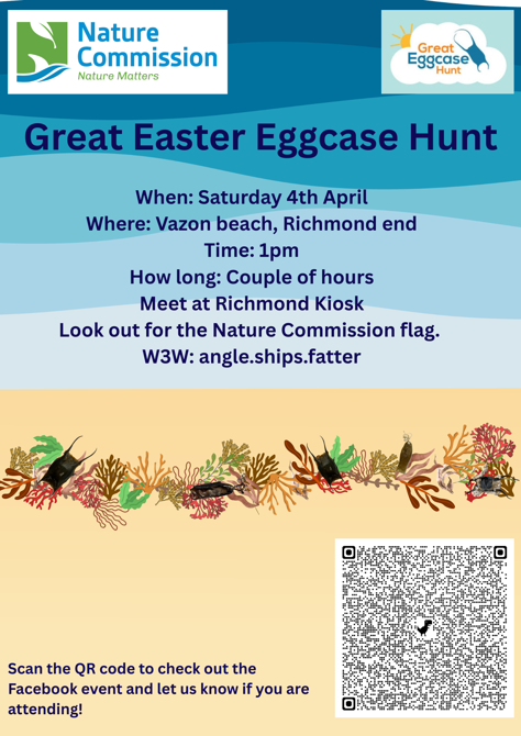 The Nature Commission is hosting an eggcase hunt with a difference during the easter weekend. We will be looking for mermaid's purses or shark and skate (ray) eggcases. For more information see the poster below.
